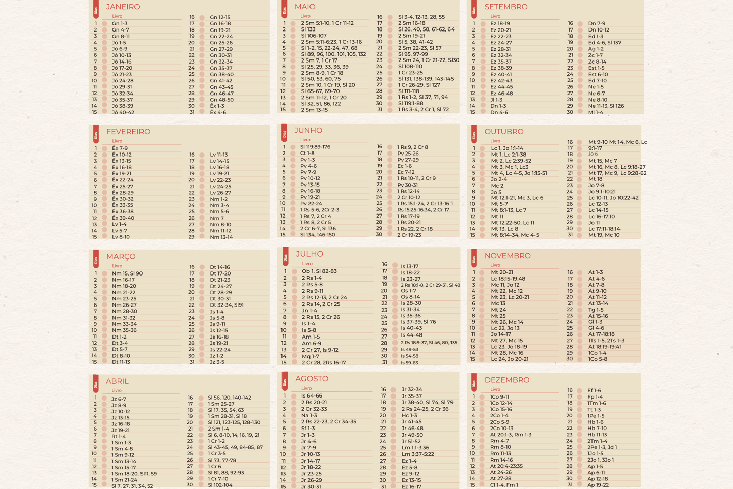 Nesta seção você encontra o Plano de Leitura Anual da Bíblia em 2026, organizado de forma cronológica para auxiliar na leitura diária e contínua das Escrituras ao longo do ano.